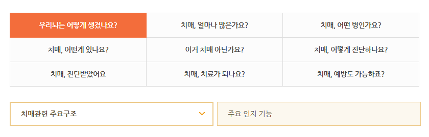 | 알츠하이머형 치매 | 전체 치매의 70% 이상 차지. 기억력 감퇴부터 시작 |